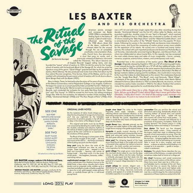 Фірмова вінілова платівка (VINYL)Ritual of the Savage is an album by American composer Les Baxter, released in 1951 often cited as one of the most important exotica albums. The album featured lush orchestral arrangements along with tribal rhythms and offered such classics as "Quiet Village", "Jungle River Boat", "Love Dance", and "Stone God."
