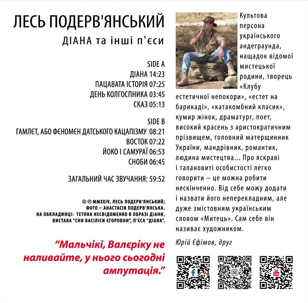 Шедевр сатиричного мистецтва. "Діана та інші п'єси" від Леся Подерв'янського - це вініл, який не просто звучить, він розмовляє з вами, змушує сміятися та рефлектувати.
