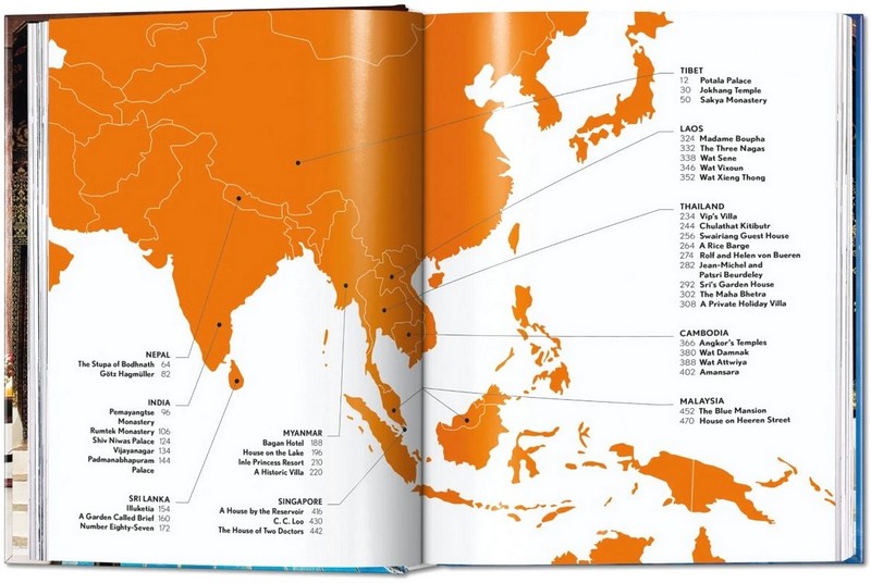 This showcase features about 40 exceptional locations across Tibet, Nepal, India, Sri Lanka, Myanmar, Thailand, Laos, Cambodia, Singapore, and Malaysia. Highlights include traditional Burmese stilt houses; the breathtaking Shiv Niwas Palace in India, visited by James Bond in Octopussy; Cambodian temples; a rice barge-turned houseboat in Thailand; the “Blue Mansion”, an magnificient, indigo-painted courtyard house featured in the film Indochine; a breathtaking garden designed by Sri Lankan architect Geoffrey Bawa; and many, many more.