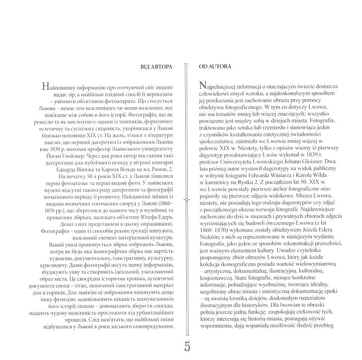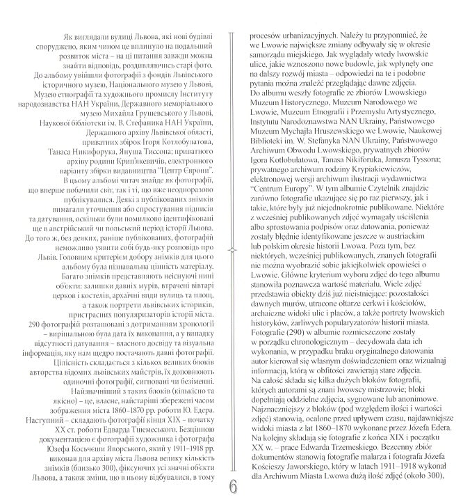Від другої половини XIX ст. фотографія продовжила давню традицію графічних зображень Львова. Завдяки сумлінній фотографічній фіксації урбанізаційних процесів сьогодні ми маємо можливість спостерігати за життям міста упродовж останніх 150 років. Окрім того, фотографія надає чудову можливість побачити відомі з літератури неіснуючі нині об’єкти, вигляд яких змінив або знищив невблаганний час. Увазі читачів пропонується альбом із 290 світлинами Львова. Головна мета видання – привернути увагу до багатої історичної спадщини та втамувати цікавість усіх шанувальників 750-річного міста.