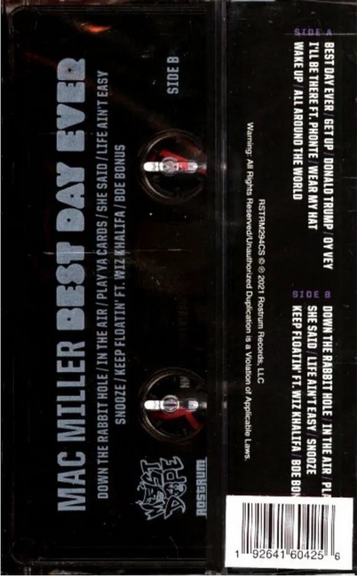 Ліцензійна касета (CASSETTE)Best Day Ever is the fifth mixtape by American rapper Mac Miller. It was released by Rostrum Records on March 11, 2011, as the follow-up to Miller's acclaimed mixtape K.I.D.S. (2010). The mixtape consists of sixteen songs produced by nine producers (predominantly ID Labs), and includes features from rappers Wiz Khalifa and Phonte.