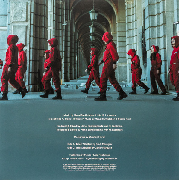 "La Casa de Papel, також відомий як Money Heist, це хітовий оригінальний серіал Netflix, створений Алексом Піною. Історія слідкує за незвичайною групою грабіжників, яка намагається здійснити найдосконаліший грабіж в історії Іспанії – викрасти два мільярди євро з Королівського монетного двору Іспанії. Спочатку серіал планували як обмежену серію, що складається з двох частин, але через світовий успіх його було продовжено і розширено до п'яти частин, розділених на три сезони. La Casa de Papel отримав кілька нагород, включаючи Міжнародну Еммі за найкращий драматичний серіал, а також нагороду Critics’ Choice за найкращий іноземний мовний серіал. До серіалу додається оригінальний саундтрек від Манеля Сантістебана та Івана М. Лакамари, який включає теплі вокали жіночого голосу, етнічні ударні інструменти та іспанську гітару. У музичному супроводі дві версії головної теми "My Life Is Going On", виконані іспанською співачкою Сесілією Крулл. La Casa de Papel тепер доступний на вінілі вперше у вигляді ексклюзивного видання магазину "At The Movies Shop" у кількості 250 індивідуально пронумерованих копій на прозорому вінілі. У комплект вінілу входить вкладиш, спеціальний друк і ексклюзивна маска Далі у вирізаному вигляді."