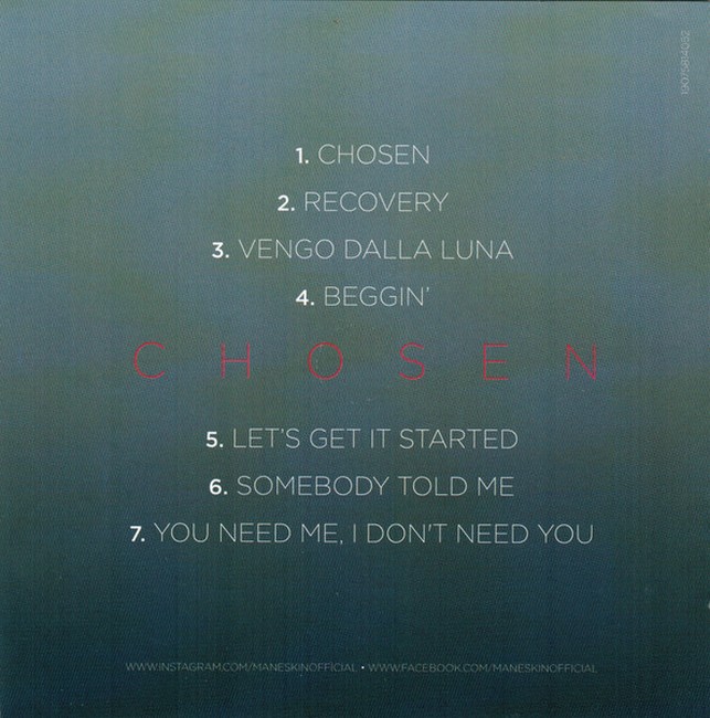 Фірмовий CD диск (CD)Chosen is the debut extended play by Italian rock band Maneskin. It was released on 8 December 2017 and peaked at number 3 on the Italian Albums Chart. The EP includes the single with the same name and another original song ("Recovery"), both in English, and various cover songs performed during the eleventh season of X Factor Italia. The EP was certified platinum and in addition its tracks collected two platinum and four gold certifications by FIMI.