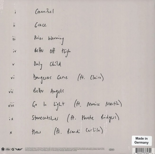 Фірмова вінілова платівка (VINYL)Self-Titled is the debut studio album by Marcus Mumford, released on 16 September 2022 via Island Records. The album features guest appearances by Phoebe Bridgers, Brandi Carlile, Clairo, and Monica Martin, in addition to being produced by Blake Mills.