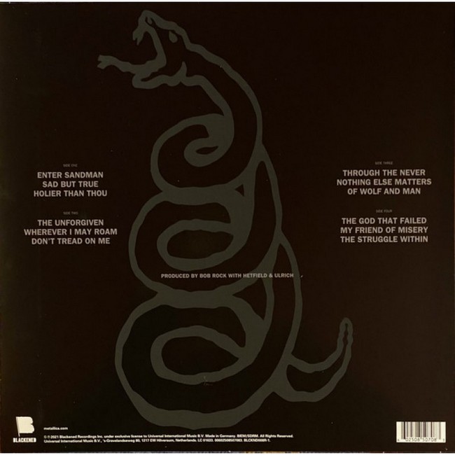 Фірмова вінілова платівка (VINYL)Metallica (commonly known as The Black Album) is the fifth studio album by American heavy metal band Metallica. It was released on August 12, 1991, by Elektra Records. Recording sessions took place at One on One Recording Studios in Los Angeles over an eight-month span that frequently found Metallica at odds with their new producer Bob Rock. The album marked a change in the band's music from the thrash metal style of their previous four albums to a slower, heavier, and more refined sound.