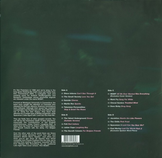 Фірмова вінілова платівка (VINYL)Late Night Tales: MGMT is a mix album compiled by the band MGMT's members Andrew VanWyngarden and Ben Goldwasser and released on October 3, 2011. The album is the 25th in the Late Night Tales series.