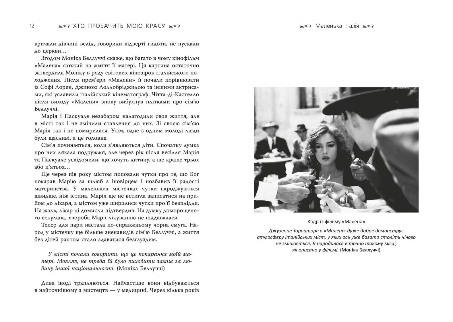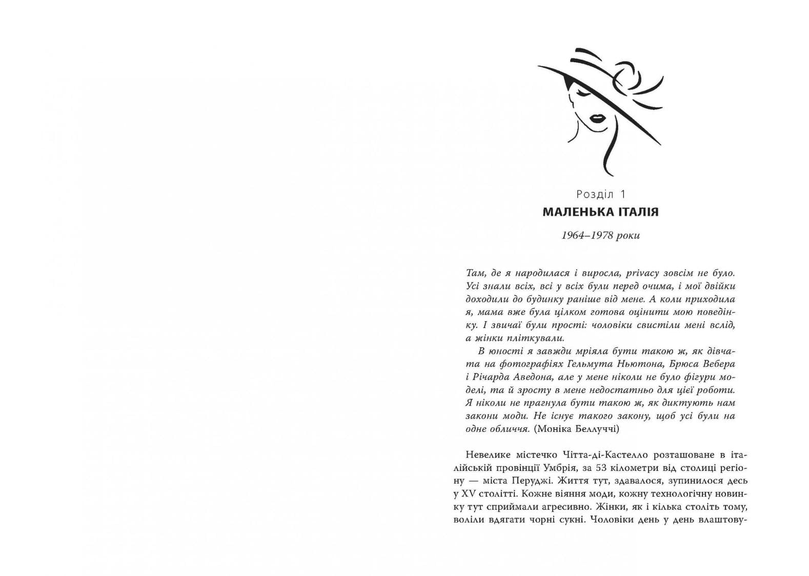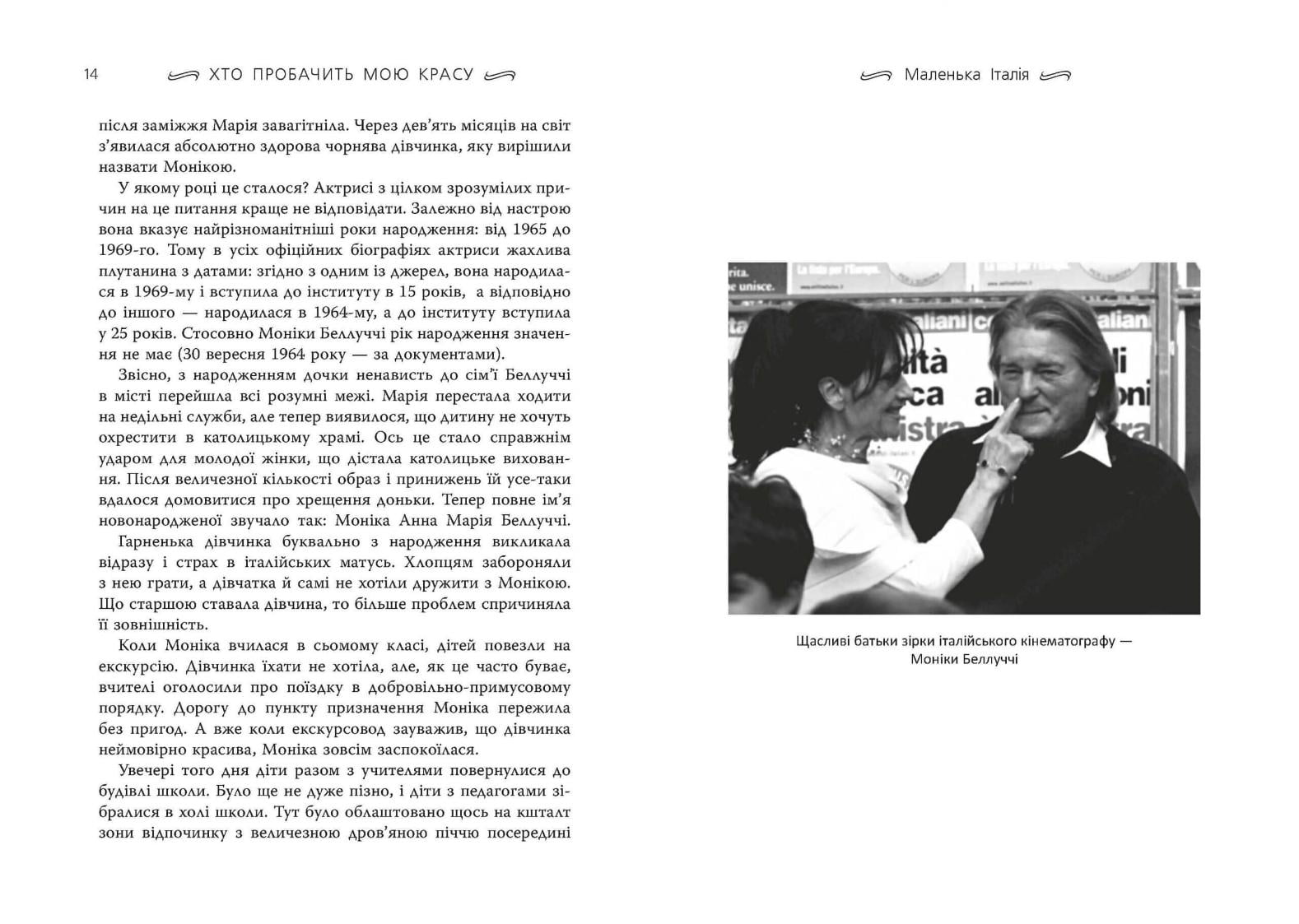 Моніка Беллуччі, яка народилася в провінційному італійському містечку, з раннього дитинства була неймовірно гарненькою. Це подобалось не всім, і згодом Моніці довелося постійно доводити, что вона не тільки вродлива, а й розумна дівчина. Саме тому після школи красуня обрала юридичний факультет університету в Перуджі. Тоді ж почалася і її робота моделлю. Поворотним моментом у житті Моніки Беллуччі стало укладання 1988 року контракту з усесвітньо відомим модельним агентством Elite Model Management, після чого кар’єра прекрасної італійки пішла вгору. Десь за рік обкладинка журналу мод із фотографією юної моделі трапилась на очі відомому режисеру, і розпочався найдовший із романів Моніки, що триває і дотепер,— із кінематографом. Звісно, в її житті була і справжня історія кохання. За парою Белуччі—Кассель, затамувавши подих, спостерігав увесь світ, і цей самий світ розчаровано зітхнув, коли вони все ж таки розлучилися.Приголомшлива й неймовірна біографія останньої діви італійського кінематографу — у цій відвертій книжці.