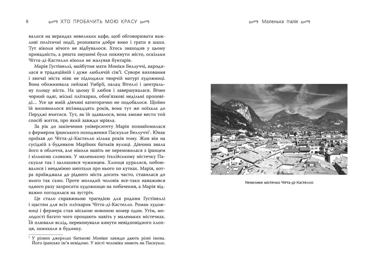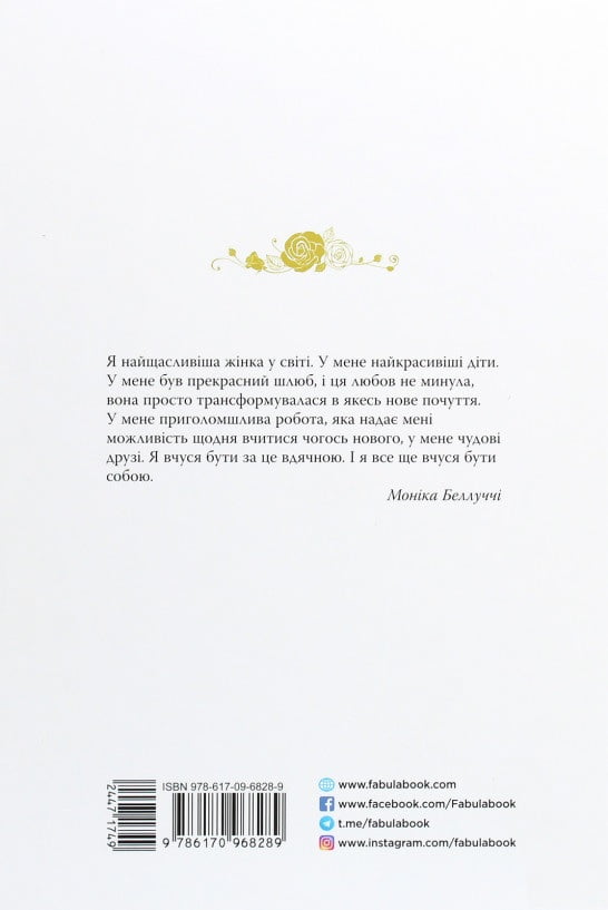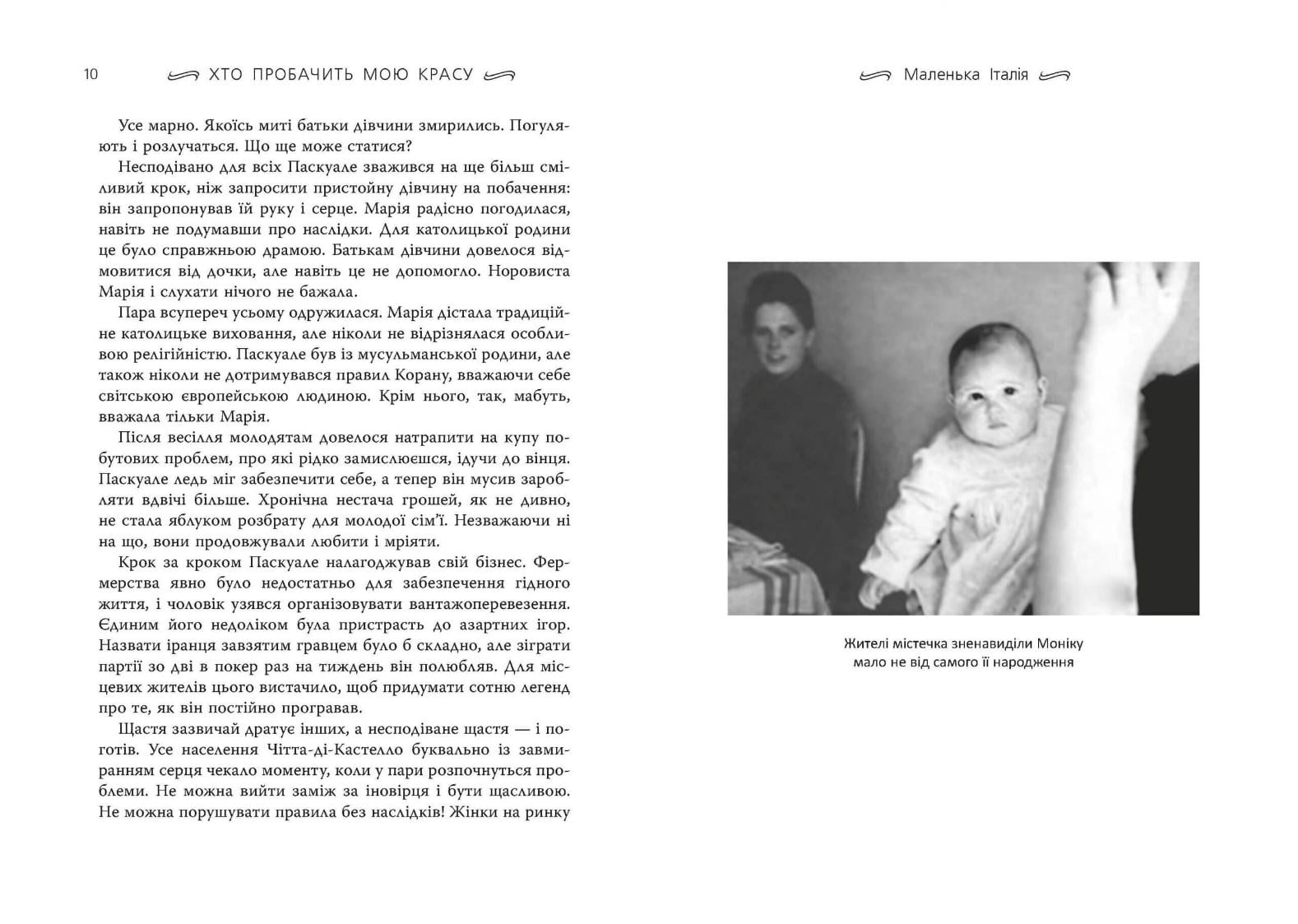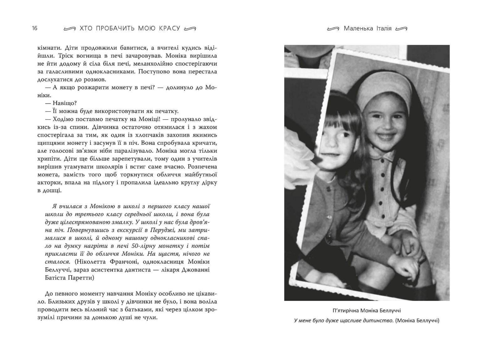 Моніка Беллуччі, яка народилася в провінційному італійському містечку, з раннього дитинства була неймовірно гарненькою. Це подобалось не всім, і згодом Моніці довелося постійно доводити, что вона не тільки вродлива, а й розумна дівчина. Саме тому після школи красуня обрала юридичний факультет університету в Перуджі. Тоді ж почалася і її робота моделлю. Поворотним моментом у житті Моніки Беллуччі стало укладання 1988 року контракту з усесвітньо відомим модельним агентством Elite Model Management, після чого кар’єра прекрасної італійки пішла вгору. Десь за рік обкладинка журналу мод із фотографією юної моделі трапилась на очі відомому режисеру, і розпочався найдовший із романів Моніки, що триває і дотепер,— із кінематографом. Звісно, в її житті була і справжня історія кохання. За парою Белуччі—Кассель, затамувавши подих, спостерігав увесь світ, і цей самий світ розчаровано зітхнув, коли вони все ж таки розлучилися.Приголомшлива й неймовірна біографія останньої діви італійського кінематографу — у цій відвертій книжці.