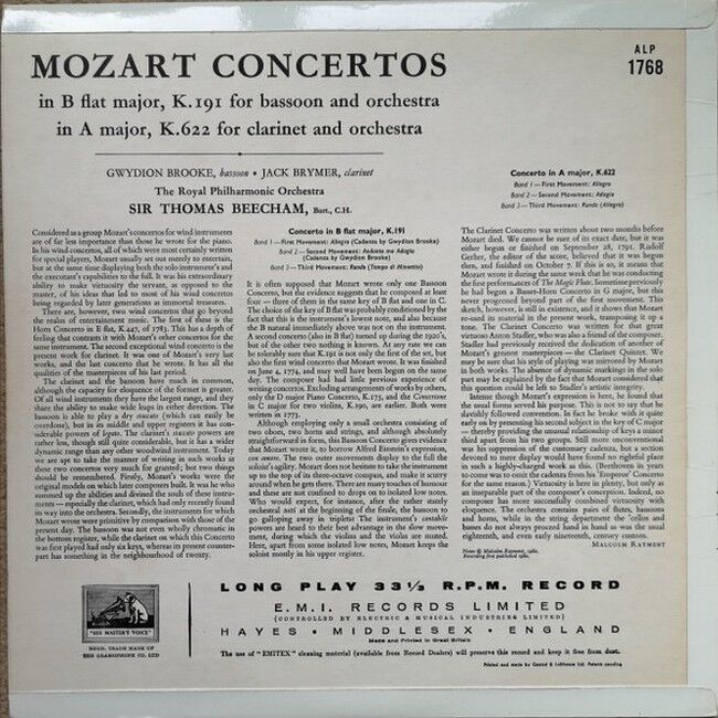 Mozart - Gwydion Brooke, Jack Brymer, Royal Philharmonic Orchestra, Sir Thomas Beecham – Concerto's In B Flat Major, K.191 For Bassoon And Orchestra; In A Major, K.622 For Clarinet And Orchestra