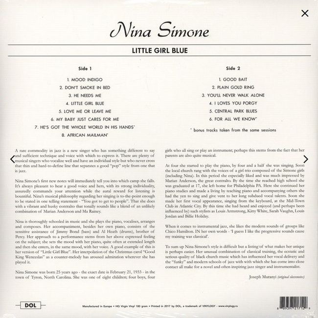 Фірмова вінілова платівка (VINYL)Little Girl Blue: Jazz as Played in an Exclusive Side Street Club is the debut studio album by Nina Simone. Recorded in late 1957, it was eventually released by Bethlehem Records in February 1959. Due to the length of time the album had taken to be released and the lack of any promotional single either immediately before or alongside the album, Simone would become disillusioned with Bethlehem and sign with Colpix Records in April 1959. She recorded the tracks for her second album - what would become The Amazing Nina Simone - the same month. However, in May Bethlehem finally released a single, "I Loves You, Porgy" and gave Simone her first hit later that year, peaking at number 18 on the pop charts, and number 2 on the R&B charts. Helped by the profile of the single, the album too went on to become a chart success.