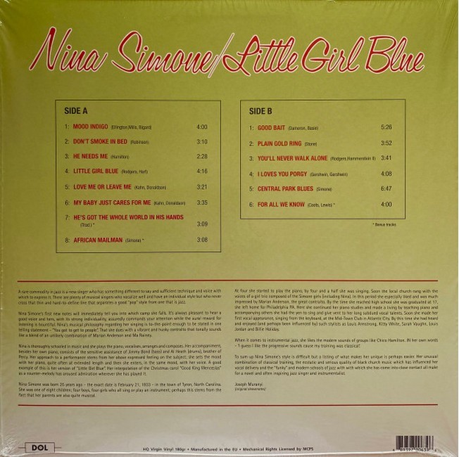 Фірмова вінілова платівка (VINYL)Little Girl Blue: Jazz as Played in an Exclusive Side Street Club is the debut studio album by Nina Simone. Recorded in late 1957, it was eventually released by Bethlehem Records in February 1959. Due to the length of time the album had taken to be released and the lack of any promotional single either immediately before or alongside the album, Simone would become disillusioned with Bethlehem and sign with Colpix Records in April 1959. She recorded the tracks for her second album - what would become The Amazing Nina Simone - the same month. However, in May Bethlehem finally released a single, "I Loves You, Porgy" and gave Simone her first hit later that year, peaking at number 18 on the pop charts, and number 2 on the R&B charts. Helped by the profile of the single, the album too went on to become a chart success.