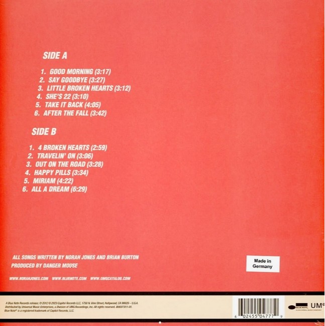 Фірмова вінілова платівка (VINYL)Little Broken Hearts (stylized as ...Little Broken Hearts) is the fifth studio album by American singer and songwriter Norah Jones, released on April 25, 2012, by Blue Note Records. The album was produced by Brian Burton, better known as Danger Mouse, who is notable for his production work with the Black Keys, Gnarls Barkley, and Beck among others.
