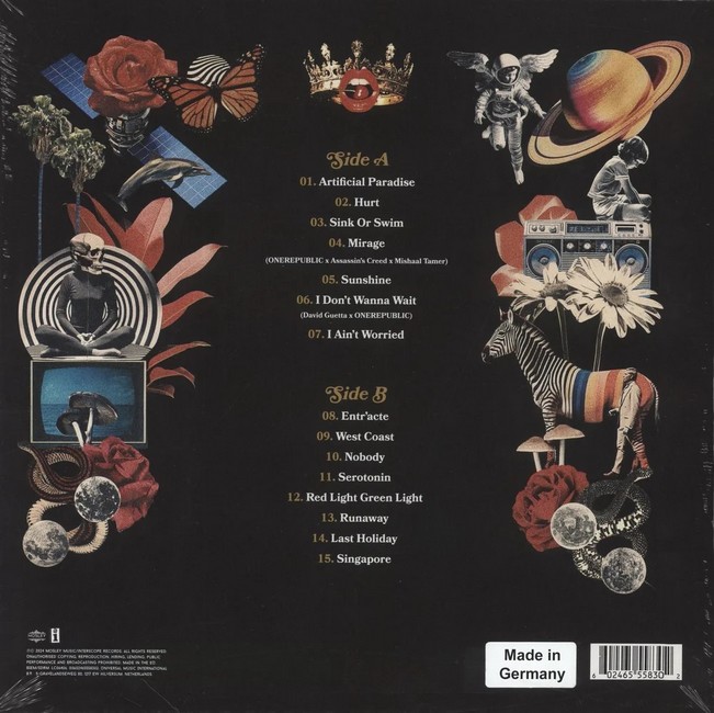 Фірмова вінілова платівка (VINYL)Artificial Paradise is the sixth studio album by American pop rock band OneRepublic, released on July 12, 2024, through Mosley Music Group and Interscope Records. It follows their fifth studio album Human (2021), and includes the singles "Sunshine", "West Coast", "I Ain't Worried", "Runaway", "Mirage" with Mishaal Tamer (for Assassin's Creed Mirage), "I Don't Wanna Wait" with David Guetta, "Nobody", and "Fire (Official UEFA Euro 2024 Song)" with Meduza and Leony.