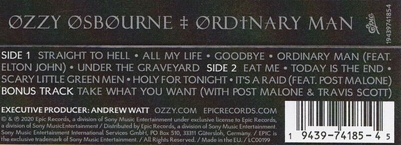 Ліцензійна касета (Cassette)Ordinary Man is the twelfth studio album by English heavy metal singer Ozzy Osbourne. The album features guest appearances from Elton John, Post Malone and Travis Scott. It was released on 21 February 2020 through Epic Records.
