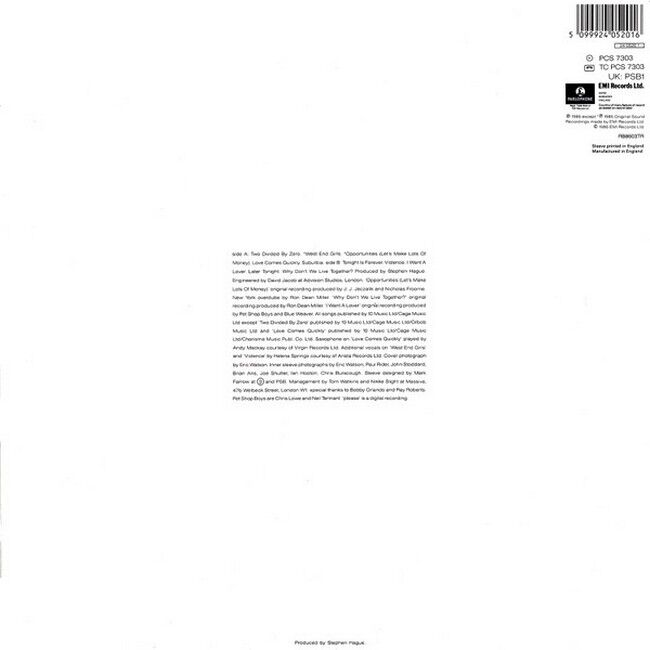 Please is the debut studio album by English synth-pop duo Pet Shop Boys, released on 24 March 1986 by Parlophone in the United Kingdom and by EMI America Records in the United States. According to the duo, the album's title was chosen so that people could go into a record shop and say "Can I have the Pet Shop Boys album, please?"[9] Please featured the number one hit "West End Girls" and nine other songs, including the singles "Opportunities (Let's Make Lots of Money)", "Love Comes Quickly", and "Suburbia".