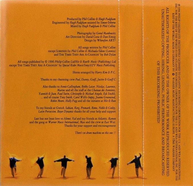 Ліцензійна касета (CASSETTE)Dance into the Light is the sixth solo studio album by English drummer and singer-songwriter Phil Collins, released on 8 October 1996 in the United States and on 21 October 1996 in the United Kingdom by Face Value Records. It features guest backing vocals from some of Collins' touring accompanists, including Arnold McCuller and Amy Keys. It was the first album that Collins released as a full-time solo artist, having left Genesis earlier that year.