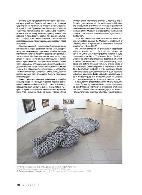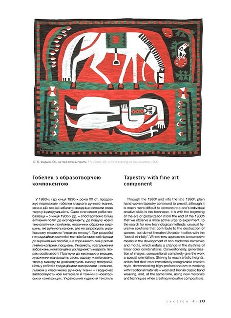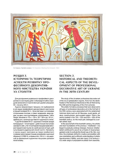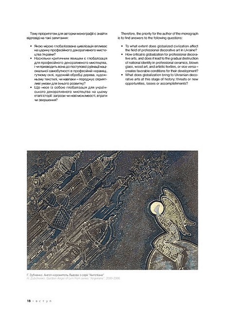 Книга пропонує аналіз широкого історико-культурного матеріалу, що дозволило авторці виявити та розкрити значні образно-пластичні й художньо-стильові трансформації в добу глобалізації в таких видах професійного декоративного мистецтва України як кераміка, скло, художня обробка дерева, гобелен, батик, нетрадиційний текстиль. Дослідниця вважає, що культурна глобалізація підштовхує українських митців декоративного мистецтва у їхній творчості до національної ідентифікації, спрямовує до пошуків архетипів своєї культури, стимулює до збереження національної самобутності. Тому входження українського професійного декоративного мистецтва на зламі ХХ-ХХІ ст. у світовий контекст не викликає небезпеки розчинення в ньому. Авторка переконливо доводить, що історично утворене, але осучаснене професійне декоративне мистецтво, яке спирається на багатовікові традиції унікальної культурної спадщини, є ґрунтом для поширення в суспільстві України доби глобалізації ознак національно-культурної ідентичності.Українсько-англійське видання розраховане на мистецтвознавців, істориків, музейників, а також широке коло шанувальників українського мистецтва та культури. Монографія може слугувати науковцям, викладачам, студентам мистецьких вишів джерелом для вивчення декоративного мистецтва України періоду ХХ–ХХІ ст.