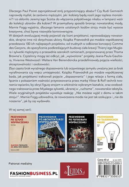 W dziejach ewoluujacej mody pojawiali sie liczni projektanci, wprowadzajacy nowatorskie, skrajnie inne niz dotychczas ubiory. Przewodnik po modzie wspolczesnej przedstawia 100 ich najlepszych projektow, od trudnych w odbiorze koncepcji Comme des Garcons, do specyficznie podkreslajacych budowe ciala kreacji Thierry'ego Muglera i sylwetki mezczyzny o przesadnie szerokich ramionach, proponowanej przez Thoma Browne'a. Czytelnicy moga tez odkryc, jak „wyzwolone” projekty Jeana-Paula Gaultiera, Vivienne Westwood i Waltera Van Beirendoncka przedefiniowaly pojecia wielkosci, akceptowalnosci i osobowosci. Zbyt czesto brak wyraznego dopasowania lub oczywistego zamyslu uwazany jest za brak wyrafinowania czy wrecz umiejetnosci.