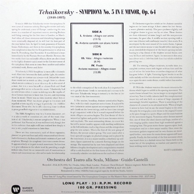 Фірмова вінілова платівка (VINYL)The Symphony No. 5 in E minor, Op. 64 by Pyotr Ilyich Tchaikovsky was composed between May and August 1888 and was first performed in Saint Petersburg at the Mariinsky Theatre on November 17 of that year with Tchaikovsky conducting. It is dedicated to Theodor Ave-Lallemant.