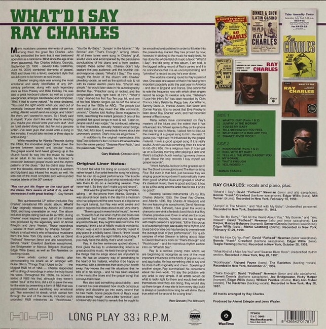 Фірмова вінілова платівка (VINYL)What'd I Say is an album by American musician Ray Charles, released by Atlantic Records in late 1959. His sixth album since the debut Ray Charles in 1957, What'd I Say compiled a range of Charles' material, including his first top 10 hit, the title track "What'd I Say". The album became his first gold record., and is included in Robert Christgau's "Basic Record Library" of 1950s and 1960s recordings, published in Christgau's Record Guide: Rock Albums of the Seventies (1981).