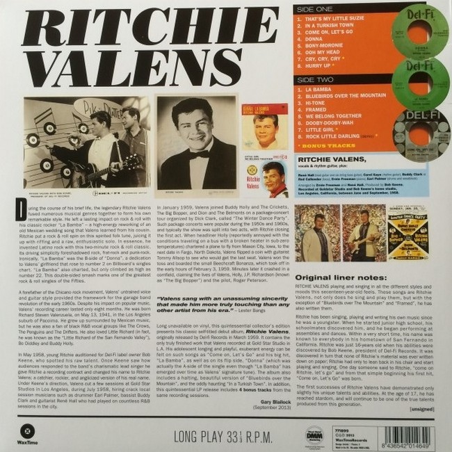 Фірмова вінілова платівка (VINYL)Richard Steven Valenzuela (May 13, 1941 – February 3, 1959), better known by his stage name Ritchie Valens, was an American guitarist, singer and songwriter. A rock and roll pioneer and a forefather of the Chicano rock movement, Valens died in a plane crash just eight months after his breakthrough.