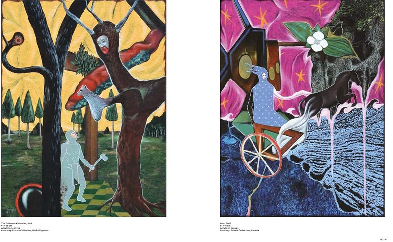 Working with acrylic on canvas, glass painting, dioramas and drawing, Filipino artist Rodel Tapaya (born 1980) is inspired by folktales and his precolonial research. His reinterpretations of traditional craft methods are gathered here.