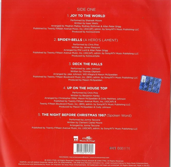 Фірмова вінілова платівка (VINYL)Sony Pictures Animation revealed that an extended play album based on a throwaway joke featured in Into the Spider-Verse was set to be released on December 21, 2018. Producer Phil Lord was unaware of Chris Pine's ability to sing prior to recording. The EP, titled A Very Spidey Christmas, features 5 Christmas-based songs performed by cast members Chris Pine, Shameik Moore, Jake Johnson, and Jorma Taccone. The EP features a cover of the song "Jingle Bells" titled "Spidey-Bells (A Hero's Lament)", performed by Pine, which was featured on the film's end credits. A cover of "Deck the Halls" by Johnson is also featured in the EP. Both songs were released as singles on December 20, 2018.