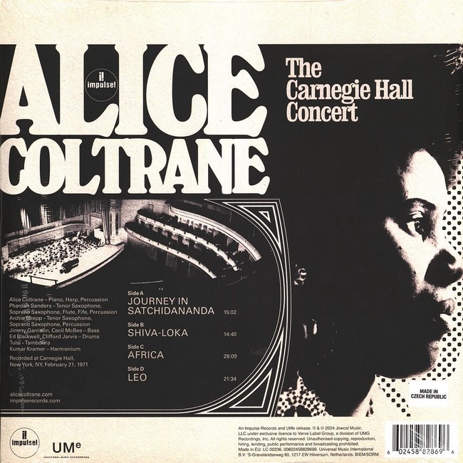 Фірмова вінілова платівка (VINYL)The Carnegie Hall Concert is a live album by Alice Coltrane. It was recorded at Carnegie Hall in New York City on February 21, 1971, and was released in 2024 by Impulse! Records. On the album, Coltrane appears on piano and harp, and is joined by saxophonists Pharoah Sanders and Archie Shepp, double bassists Jimmy Garrison and Cecil McBee, and drummers Ed Blackwell and Clifford Jarvis.