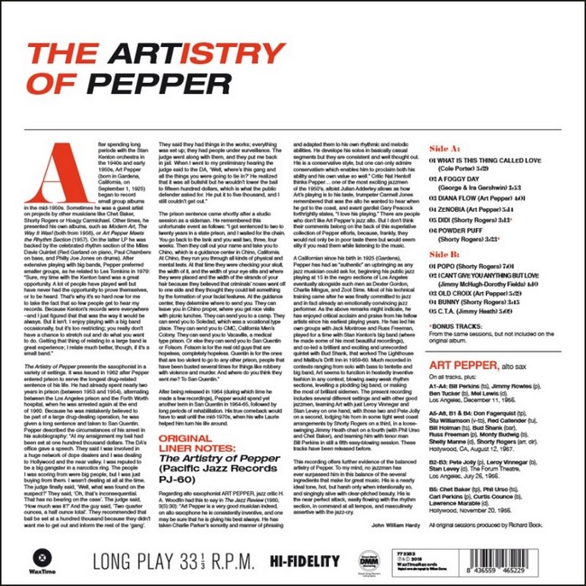 Фірмова вінілова платівка (VINYL)Arthur Edward Pepper Jr. (September 1, 1925 – June 15, 1982) was an American jazz musician, most known as an alto saxophonist. He occasionally performed and recorded on tenor saxophone, clarinet (his first instrument) and bass clarinet. Active primarily in West Coast jazz, Pepper first came to prominence in Stan Kenton's big band. He was known for his emotionally charged performances and several stylistic shifts throughout his career, and was described by critic Scott Yanow as having "attained his goal of becoming the world's greatest altoist" at the time of his death in 1982.