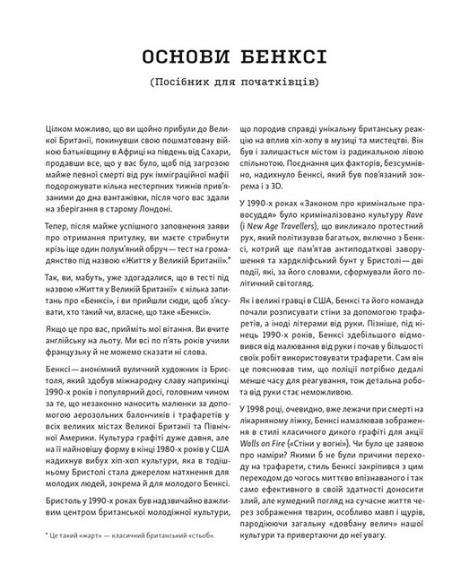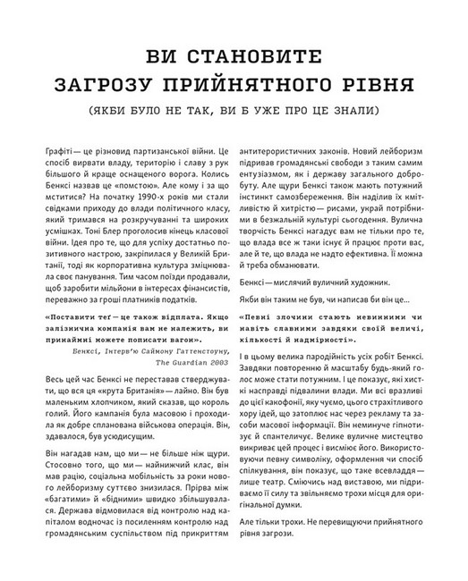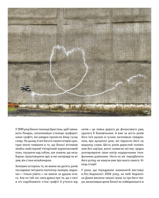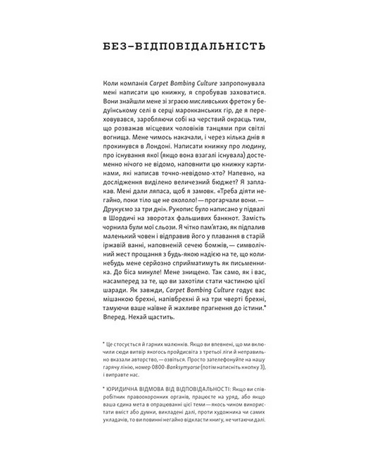 Коли компанія Carpet Bombing Culture запропонувала мені написати цю книжку, я спробував заховатися. Вони знайшли мене зі зграєю мисливських фреток у бедуїнському селі в серці марокканських гір, де я переховувався, заробляючи собі на черствий окраєць тим, що розважав місцевих чоловіків танцями при світлі вогнища. Мене чимось накачали, і через кілька днів я прокинувся в Лондоні. Написати книжку про людину, про існування якої (якщо вона взагалі існувала) достеменно нічого не відомо, наповнити цю книжку картинами, які написав точно-невідомо-хто? Напевно, на дослідження виділено величезний бюджет? Я заплакав. Мені дали ляпаса, щоб я замовк. «Треба діяти негайно, поки тіло ще не охололо!, — прогарчали вони. — Друкуємо за три дні». Рукопис було написано у підвалі в Шордичі на зворотах фальшивих банкнот. Замість чорнила були мої сльози. Я чітко пам’ятаю, як підпалив маленький човен і відправив його у плавання в старій іржавій ванні, наповненій сечею бомжів, — символічний жест прощання з будь-якою надією на те, що коли-небудь мене серйозно сприйматимуть як письменника. До біса минуле! Мене знищено. Так само, як і вас, насамперед за те, що ви захотіли стати частиною цієї шаради. Як завжди, Carpet Bombing Culture годує вас мішанкою брехні, напівбрехні й на три чверті брехні, втамовуючи ваше наївне й жахливе прагнення до істини. Вперед. Хай щастить. — Патрік Поттер, автор тексту.Це фотоальбом його робіт, а також тексти про діяльність та світогляд. Книга така ж, як і сам митець: невловима. Ви не знатимете достеменно, де правда, а де ні, чи точно автор графіті саме Бенкcі. Кожна сторінка надихає, але й викликає сумніви.