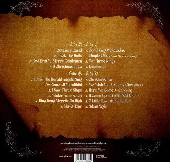 Фірмова вінілова платівка (VINYL)Winter Carols is the sixth studio album by the group Blackmore's Night, released in the United Kingdom on October, 2006, and in the United States on November 7, 2006. It is a Christmas themed album. The cover artwork for this album, painted by Karsten Topelmann, is an adaptation of a street in Rothenburg ob der Tauber, Germany, in line with the band's heavy Renaissance influence.