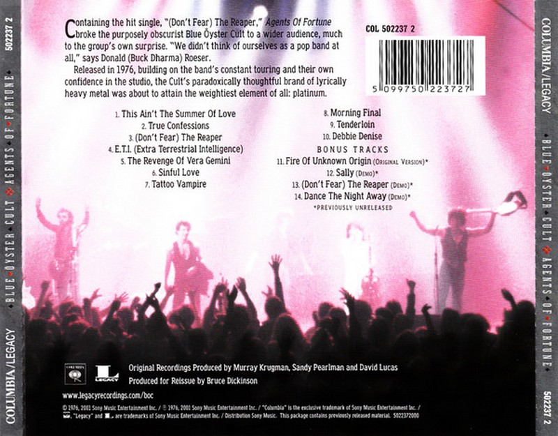 Фірмовий CD-дискAgents of Fortune is the fourth studio album by American rock band Blue Oyster Cult, released on May 21, 1976 by Columbia Records. The Platinum-selling album peaked at No. 29 on the U.S. Billboard chart, while the cryptic single "(Don't Fear) The Reaper" peaked at No. 12 on the Billboard Hot 100 singles chart, making it BOC's biggest hit. The band became a bigger concert attraction after the release of the album, in part due to extensive airplay of "(Don't Fear) The Reaper", to this day a staple of rock-station playlists. Additionally, this is the only album in the group's discography to have at least one lead vocal performance by each original band member. It was also their only album to not include any songs written by Eric Bloom. However, the 2020 live release 40th Anniversary: Agents of Fortune Live 2016 adds Bloom's name to the authorship credits for "E.T.I. (Extra Terrestrial Intelligence)."