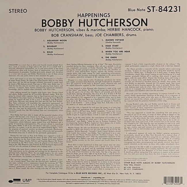Фірмова вінілова платівка (VINYL)Happenings is an album by the jazz vibraphonist Bobby Hutcherson, released in 1967 on the Blue Note label. The album contains six compositions by Hutcherson, and one by Herbie Hancock, "Maiden Voyage".