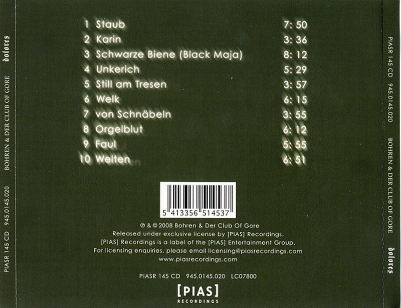 Фірмовий компакт-диск (CD)Dolores is the sixth album by the jazz/ambient band Bohren & der Club of Gore.