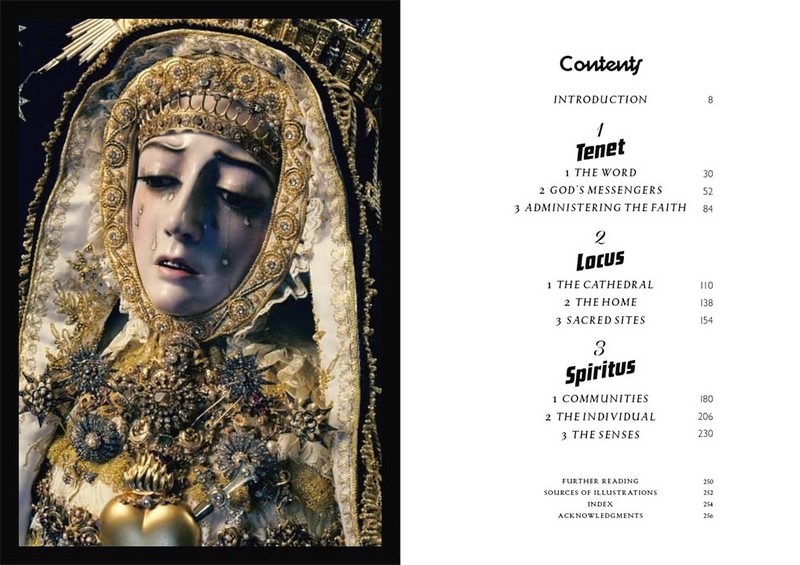 Catholica is organized into three sections?”Tenet,” “Locus,” and “Spiritus”?each with three themed subdivisions. Part one introduces the centerpieces of the faith, surveying symbolism in the artistic representation of the holy family, apostles, and saints in stories from scripture. The second part examines places of worship, identifying the essential elements of the cathedral and presenting evocative images of roadside shrines. The third part explores celebrations and traditions, in addition to personal devotional tools and jewelry.