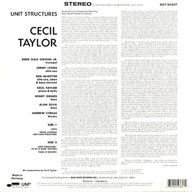 Фірмова вінілова платівка (VINYL)Unit Structures is a 1966 studio album by free jazz pianist Cecil Taylor, released by Blue Note Records. Unit Structures was Taylor's first album on Blue Note. He released Conquistador! on the label in the same year, with a similar lineup. Jesse Jarnow of Pitchfork described the album as "among the most intense of the early free jazz albums". The album was accompanied with an essay written by Cecil Taylor, titled Sound Structure of Subculture Becoming Major Breath/Naked Fire Gesture.