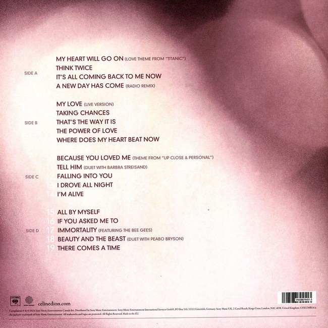 Фірмова вінілова платівка (VINYL)My Love: Essential Collection is the third English-language greatest hits album by Canadian recording artist Celine Dion. It was released by Columbia Records on 24 October 2008 as the follow-up to her previous English-language compilation, All the Way... A Decade of Song (1999). In the album's liner notes, she dedicated this collection of songs, recorded between 1990 and 2008, to her fans who supported her throughout the years.