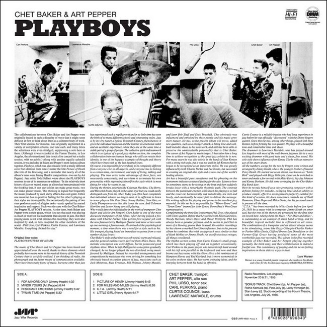 Фірмова вінілова платівка (VINYL)Playboys is a 1956 jazz album featuring trumpeter Chet Baker and saxophonist Art Pepper. The album was the third collaboration between Pepper and Baker, following The Route and Chet Baker Big Band. All three albums were recorded in 1956.
