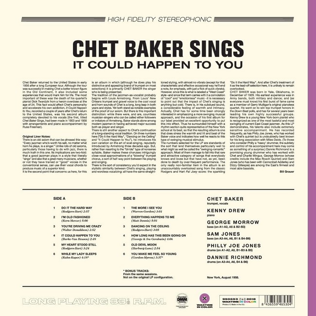 Фірмова вінілова платівка (VINYL)(Chet Baker Sings) It Could Happen to You is an album by jazz trumpeter and vocalist Chet Baker. It follows a formula similar to two other Baker albums, Chet Baker Sings (1954) and Chet Baker Sings and Plays with Bud Shank, Russ Freeman & Strings (recorded in 1955, released in 1964) in which he sings traditional pop standards in a jazzy fashion. Unlike the aforementioned records, on It Could Happen to You, on a few tracks, Baker plays no trumpet whatsoever, opting to scat in place of an instrumental solo.