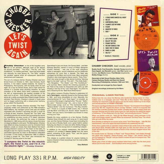 Фірмова вінілова платівка (VINYL)"Let's Twist Again" is a song written by Kal Mann and Dave Appell, and released as a single by Chubby Checker. One of the biggest hit singles of 1961, it reached No.8 on the U.S. Billboard pop chart (No.3 on Cash Box) in August of that year and subsequently reached No.2 in the UK in the spring of 1962. The song refers to the Twist dance craze and Checker's 1960 single "The Twist", a two-time U.S. No.1 single (in September 1960 and again in January 1962 on re-release).