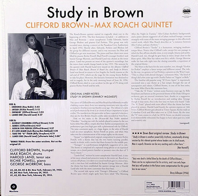 Фірмова вінілова платівка (VINYL)Study in Brown (EmArcy Records, 1955) is a Clifford Brown and Max Roach album. The album consists predominantly of originals by members of the band. The songs "Lands End", by tenor saxophonist Harold Land, and "Sandu", by Brown, have gone on to become jazz standards. The song "George's Dilemma" is also known as "Ulcer Department". Brown's solo on "Cherokee" is among the most acclaimed solos in jazz.