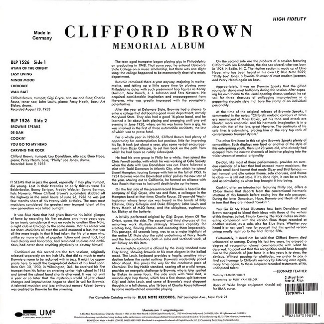 Фірмова вінілова платівка (VINYL)Memorial is a 1956 jazz album by trumpeter Clifford Brown, issued posthumously. It was originally released on the Prestige label as PRLP 7055. It principally includes fast bop pieces, also arranged for a brass section. Ira Gitler, who was supervising session for Prestige label at the time, confessed he was greatly impressed by Brown: "When Brownie stood up and took his first solo on "Philly J J", I nearly fell off my seat in the control room.