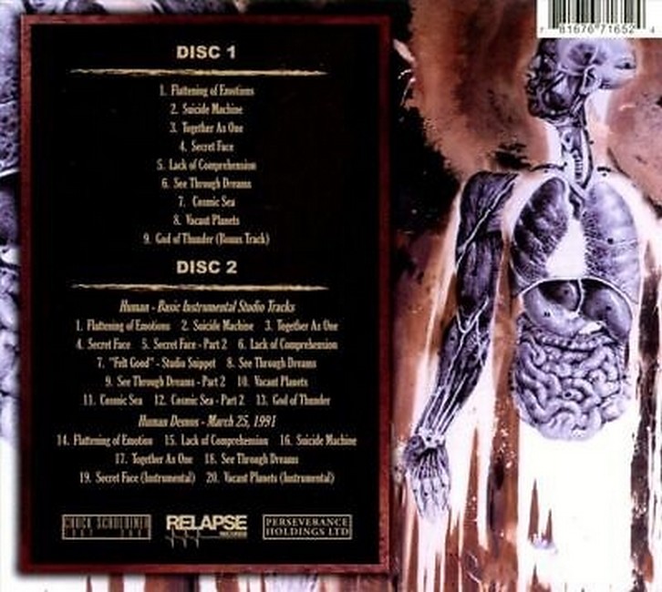 Фірмовий диск (CD)Human is the fourth studio album by Florida death metal band Death, released on October 22, 1991, by Relativity Records. The album marked the beginning of a major stylistic change for Death, being more technically complex and progressive than the band's previous efforts. This is the only album to feature Cynic members Paul Masvidal on guitar and Sean Reinert on drums, both 20 at the time, and the first to feature bassist Steve DiGiorgio.
