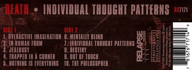 Ліцензійна касета (Cassette)Individual Thought Patterns is the fifth studio album by Florida death metal band Death, released on June 22, 1993, by Relativity Records. It is the only album by the band to feature guitarist Andy LaRocque, the first to feature drummer Gene Hoglan and the second and last to feature bassist Steve DiGiorgio. Manager Eric Greif described the album as "an angry record, angry lyrically", attributing it to his conflict with Chuck Schuldiner at the time.
