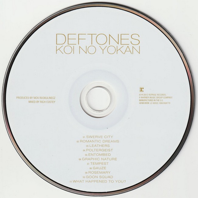 Фірмовий CD-дискKoi No Yokan is the seventh studio album by American alternative metal band Deftones, released on November 12, 2012, by Reprise Records. Its title is a phrase from the Japanese language, translating to "premonition of love". Koi No Yokan was met with widespread acclaim from critics upon its release, and debuted at number eleven on the US Billboard 200, selling over 65,000 copies in its first week of sales. According to Nielsen SoundScan, it has sold over 200,000 copies to date in the United States.