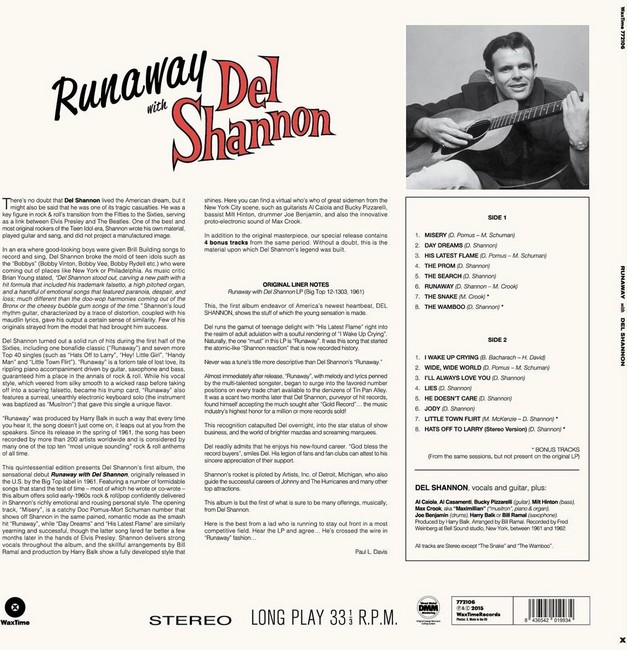 Фірмова вінілова платівка (VINYL)Runaway with Del Shannon is the 1961 debut album by American rock and roll singer-songwriter Del Shannon. It contains Shannon's best-known hit, "Runaway". It is regarded by critics as having helped bridge the period between early rock and the British Invasion.