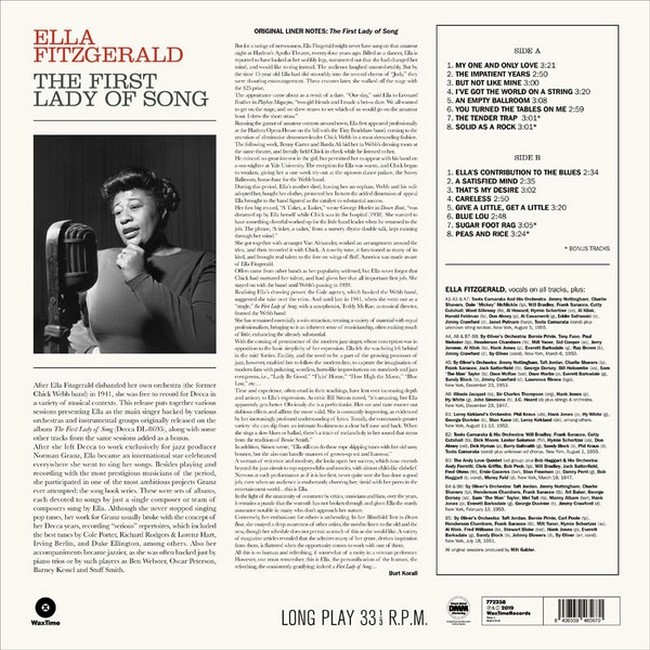 Фірмова вінілова платівка (VINYL)Ella Jane Fitzgerald (April 25, 1917 – June 15, 1996) was an American jazz singer, sometimes referred to as the "First Lady of Song", "Queen of Jazz", and "Lady Ella". She was noted for her purity of tone, impeccable diction, phrasing, timing, intonation, and a "horn-like" improvisational ability, particularly in her scat singing.
