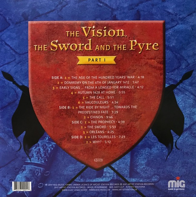 Фірмова вінілова платівка (VINYL)The Vision, the Sword and the Pyre – Part I is the eighteenth studio album by German rock band Eloy. It was released in 2017 through Artist Station Records, reaching No. 22 on the German charts and No. 46 on the Swiss charts in its first week. The album is the first part of a rock opera about the life of Jeanne d'Arc, the realization of which had been a wish of frontman Frank Bornemann's since the 1990s. The second and final part was released on 27 September 2019.