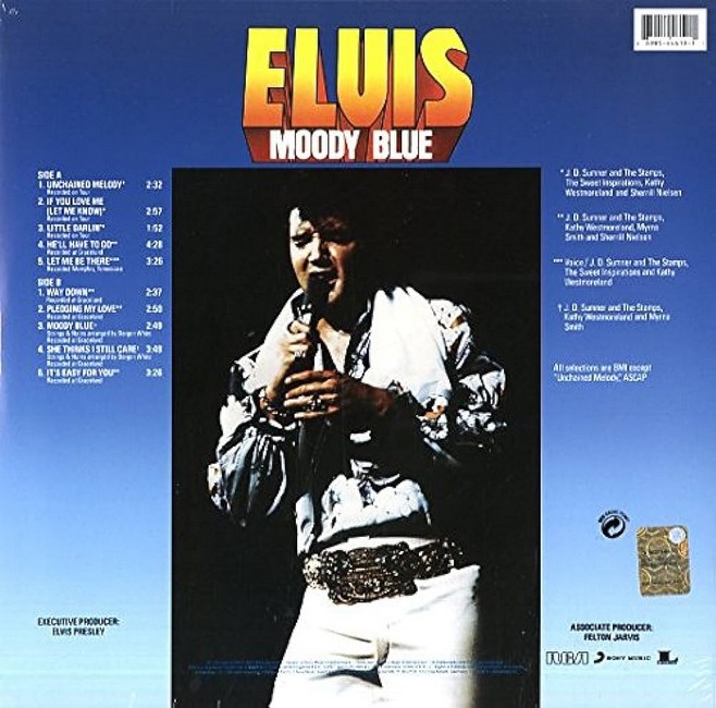Фірмова вінілова платівка (VINYL)Moody Blue is the twenty-fourth and final studio album by American singer and musician Elvis Presley, released in June 1977 by RCA Records, about two months before his death. The album was a mixture of live and studio work and included the four tracks from Presley's final studio recording sessions in October 1976 and two tracks left over from the previous Graceland session in February 1976. "Moody Blue" was a previously published hit song recorded at the earlier Graceland session and held over for this album. Also recorded at the February session was "She Thinks I Still Care". "Way Down" became a hit after Presley's death less than one month after this album's release. The album was certified Gold and Platinum on September 12, 1977, and 2? Platinum on March 27, 1992, by the RIAA.