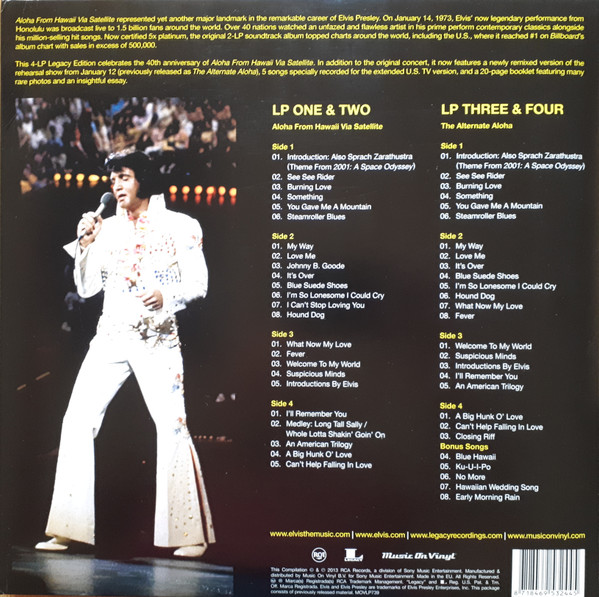 "Aloha From Hawaii Via Satellite" — это набор из 4 LP, включающий знаменитую телетрансляцию 1973 года с легендарного выступления Элвиса на тропическом острове, которое стало еще одной важной вехой в выдающейся карьере Элвиса Пресли. Согласно оригинальному выпуску на 2 LP, запись концерта представлена на первых двух дисках. Теперь вот VIP-часть программы: два дополнительных диска содержат новый микс репетиций к шоу + 5 неизданных бонус-треков. Всего пакет включает не менее 51 любимой композиции всех времен, включая "Burning Love", "Steamroller Blues" и "An American Trilogy". Пять бонусных треков были специально записаны для расширенной американской телевизионной версии шоу "Aloha From Hawaii Via Satellite". В комплекте с новыми сопроводительными заметками, ранее не публиковавшимися фотографиями и полностью ремастированным аудио, мы гарантируем, что вы испытаете наследие этого пятикратного мультиплатинового живого альбома, как будто сидите в первом ряду. Помните: 1,5 миллиарда поклонников Элвиса по всему миру не могут ошибаться! "Aloha From Hawaii Via Satellite" доступен в ограниченном издании в 2500 индивидуально пронумерованных копий на желтом цветном виниле и включает 20-страничный буклет с сопроводительными заметками, фотографиями и меморабилиями.